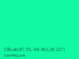 CIELab 87.55,-68.462,28.227 Color is a normal green color and the nearest color is Medium Spring Green #00fa9a. Hex code #11faa3 and RGB value is rgb(17,250,163). In RGB color space, this color is composed of 7% red, 98% green, 64% blue, In CMYK color space, this color is composed of 93% cyan, 0% magenta, 35% yellow , 2% black , In HSL color space, this color has a hue angle of 158° , 96% saturation and 52% lightness.