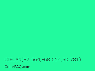 CIELab 87.564,-68.654,30.781 Color is a normal green color and the nearest color is Medium Spring Green #00fa9a. Hex code #21fa9e and RGB value is rgb(33,250,158). In RGB color space, this color is composed of 13% red, 98% green, 62% blue, In CMYK color space, this color is composed of 87% cyan, 0% magenta, 37% yellow , 2% black , In HSL color space, this color has a hue angle of 155° , 96% saturation and 55% lightness.