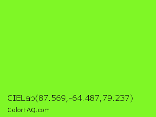 CIELab 87.569,-64.487,79.237 Color is a normal green color and the nearest color is Spring Frost #87ff2a. Hex code #7ff726 and RGB value is rgb(127,247,38). In RGB color space, this color is composed of 50% red, 97% green, 15% blue, In CMYK color space, this color is composed of 49% cyan, 0% magenta, 85% yellow , 3% black , In HSL color space, this color has a hue angle of 94° , 93% saturation and 56% lightness.