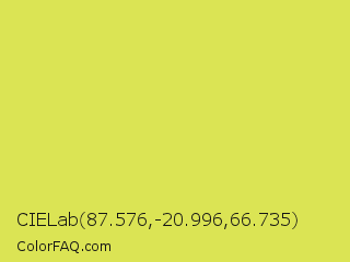 CIELab 87.576,-20.996,66.735 Color is a light yellow color and the nearest color is Maximum Green Yellow #d9e650. Hex code #dbe454 and RGB value is rgb(219,228,84). In RGB color space, this color is composed of 86% red, 89% green, 33% blue, In CMYK color space, this color is composed of 4% cyan, 0% magenta, 63% yellow , 11% black , In HSL color space, this color has a hue angle of 64° , 73% saturation and 61% lightness.