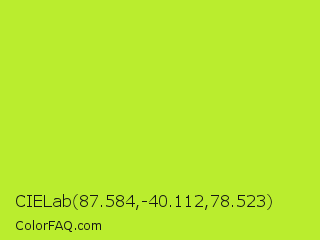 CIELab 87.584,-40.112,78.523 Color is a normal lime color and the nearest color is Green Lizard #a7f432. Hex code #baed2e and RGB value is rgb(186,237,46). In RGB color space, this color is composed of 73% red, 93% green, 18% blue, In CMYK color space, this color is composed of 22% cyan, 0% magenta, 81% yellow , 7% black , In HSL color space, this color has a hue angle of 76° , 84% saturation and 55% lightness.