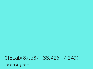 CIELab 87.587,-38.426,-7.249 Color is a light cyan color and the nearest color is Turquoise Blue #6cdae7. Hex code #6af0e8 and RGB value is rgb(106,240,232). In RGB color space, this color is composed of 42% red, 94% green, 91% blue, In CMYK color space, this color is composed of 56% cyan, 0% magenta, 3% yellow , 6% black , In HSL color space, this color has a hue angle of 176° , 82% saturation and 68% lightness.