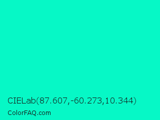 CIELab 87.607,-60.273,10.344 Color is a normal cyan color and the nearest color is Bright Turquoise #08e8de. Hex code #06f8c6 and RGB value is rgb(6,248,198). In RGB color space, this color is composed of 2% red, 97% green, 78% blue, In CMYK color space, this color is composed of 98% cyan, 0% magenta, 20% yellow , 3% black , In HSL color space, this color has a hue angle of 168° , 95% saturation and 50% lightness.