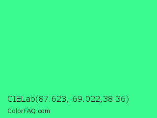 CIELab 87.623,-69.022,38.36 Color is a light green color and the nearest color is Eucalyptus #44d7a8. Hex code #3bfa8f and RGB value is rgb(59,250,143). In RGB color space, this color is composed of 23% red, 98% green, 56% blue, In CMYK color space, this color is composed of 76% cyan, 0% magenta, 43% yellow , 2% black , In HSL color space, this color has a hue angle of 146° , 95% saturation and 61% lightness.