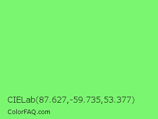 CIELab 87.627,-59.735,53.377 Color is a light green color and the nearest color is Screamin Green #66ff66. Hex code #7bf670 and RGB value is rgb(123,246,112). In RGB color space, this color is composed of 48% red, 96% green, 44% blue, In CMYK color space, this color is composed of 50% cyan, 0% magenta, 54% yellow , 4% black , In HSL color space, this color has a hue angle of 115° , 88% saturation and 70% lightness.