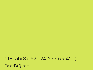 CIELab 87.62,-24.577,65.419 Color is a light yellow color and the nearest color is Maximum Green Yellow #d9e650. Hex code #d4e657 and RGB value is rgb(212,230,87). In RGB color space, this color is composed of 83% red, 90% green, 34% blue, In CMYK color space, this color is composed of 8% cyan, 0% magenta, 62% yellow , 10% black , In HSL color space, this color has a hue angle of 68° , 74% saturation and 62% lightness.