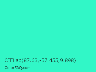 CIELab 87.63,-57.455,9.898 Color is a normal cyan color and the nearest color is Turquoise #40e0d0. Hex code #31f7c7 and RGB value is rgb(49,247,199). In RGB color space, this color is composed of 19% red, 97% green, 78% blue, In CMYK color space, this color is composed of 80% cyan, 0% magenta, 19% yellow , 3% black , In HSL color space, this color has a hue angle of 165° , 93% saturation and 58% lightness.