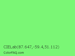 CIELab 87.647,-59.4,51.112 Color is a light green color and the nearest color is Pastel Green #77dd77. Hex code #7af675 and RGB value is rgb(122,246,117). In RGB color space, this color is composed of 48% red, 96% green, 46% blue, In CMYK color space, this color is composed of 50% cyan, 0% magenta, 52% yellow , 4% black , In HSL color space, this color has a hue angle of 118° , 88% saturation and 71% lightness.