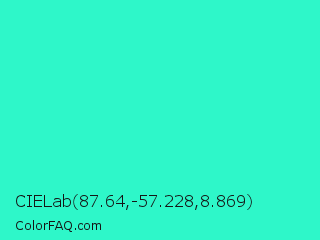 CIELab 87.64,-57.228,8.869 Color is a normal cyan color and the nearest color is Turquoise #40e0d0. Hex code #2ef7c9 and RGB value is rgb(46,247,201). In RGB color space, this color is composed of 18% red, 97% green, 79% blue, In CMYK color space, this color is composed of 81% cyan, 0% magenta, 19% yellow , 3% black , In HSL color space, this color has a hue angle of 166° , 93% saturation and 57% lightness.