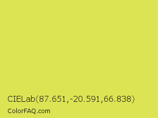 CIELab 87.651,-20.591,66.838 Color is a light yellow color and the nearest color is Maximum Green Yellow #d9e650. Hex code #dce454 and RGB value is rgb(220,228,84). In RGB color space, this color is composed of 86% red, 89% green, 33% blue, In CMYK color space, this color is composed of 4% cyan, 0% magenta, 63% yellow , 11% black , In HSL color space, this color has a hue angle of 63° , 73% saturation and 61% lightness.