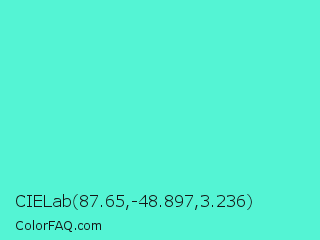 CIELab 87.65,-48.897,3.236 Color is a light cyan color and the nearest color is Turquoise #40e0d0. Hex code #54f4d4 and RGB value is rgb(84,244,212). In RGB color space, this color is composed of 33% red, 96% green, 83% blue, In CMYK color space, this color is composed of 66% cyan, 0% magenta, 13% yellow , 4% black , In HSL color space, this color has a hue angle of 168° , 88% saturation and 64% lightness.