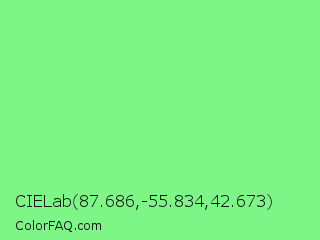 CIELab 87.686,-55.834,42.673 Color is a light green color and the nearest color is Light Green #90ee90. Hex code #7df587 and RGB value is rgb(125,245,135). In RGB color space, this color is composed of 49% red, 96% green, 53% blue, In CMYK color space, this color is composed of 49% cyan, 0% magenta, 45% yellow , 4% black , In HSL color space, this color has a hue angle of 125° , 86% saturation and 73% lightness.