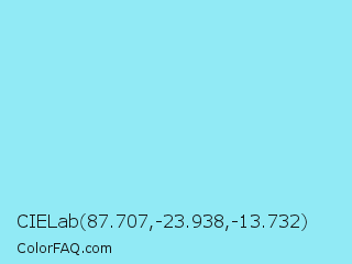 CIELab 87.707,-23.938,-13.732 Color is a light cyan color and the nearest color is Anakiwa #9de5ff. Hex code #91eaf5 and RGB value is rgb(145,234,245). In RGB color space, this color is composed of 57% red, 92% green, 96% blue, In CMYK color space, this color is composed of 41% cyan, 4% magenta, 0% yellow , 4% black , In HSL color space, this color has a hue angle of 187° , 83% saturation and 76% lightness.