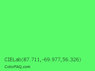 CIELab 87.711,-69.977,56.326 Color is a light green color and the nearest color is Screamin Green #66ff66. Hex code #58fa69 and RGB value is rgb(88,250,105). In RGB color space, this color is composed of 35% red, 98% green, 41% blue, In CMYK color space, this color is composed of 65% cyan, 0% magenta, 58% yellow , 2% black , In HSL color space, this color has a hue angle of 126° , 94% saturation and 66% lightness.