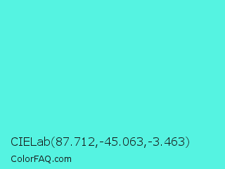 CIELab 87.712,-45.063,-3.463 Color is a light cyan color and the nearest color is Turquoise #40e0d0. Hex code #55f3e1 and RGB value is rgb(85,243,225). In RGB color space, this color is composed of 33% red, 95% green, 88% blue, In CMYK color space, this color is composed of 65% cyan, 0% magenta, 7% yellow , 5% black , In HSL color space, this color has a hue angle of 173° , 87% saturation and 64% lightness.