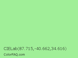 CIELab 87.715,-40.662,34.616 Color is a light green color and the nearest color is Pale Green #98fb98. Hex code #a0ef98 and RGB value is rgb(160,239,152). In RGB color space, this color is composed of 63% red, 94% green, 60% blue, In CMYK color space, this color is composed of 33% cyan, 0% magenta, 36% yellow , 6% black , In HSL color space, this color has a hue angle of 114° , 73% saturation and 77% lightness.