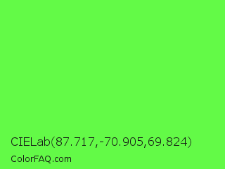 CIELab 87.717,-70.905,69.824 Color is a light green color and the nearest color is Screamin Green #66ff66. Hex code #63fa47 and RGB value is rgb(99,250,71). In RGB color space, this color is composed of 39% red, 98% green, 28% blue, In CMYK color space, this color is composed of 60% cyan, 0% magenta, 72% yellow , 2% black , In HSL color space, this color has a hue angle of 111° , 95% saturation and 63% lightness.