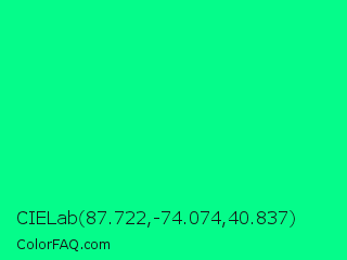 CIELab 87.722,-74.074,40.837 Color is a normal green color and the nearest color is Spring Green #00ff7f. Hex code #05fc8a and RGB value is rgb(5,252,138). In RGB color space, this color is composed of 2% red, 99% green, 54% blue, In CMYK color space, this color is composed of 98% cyan, 0% magenta, 45% yellow , 1% black , In HSL color space, this color has a hue angle of 152° , 98% saturation and 50% lightness.