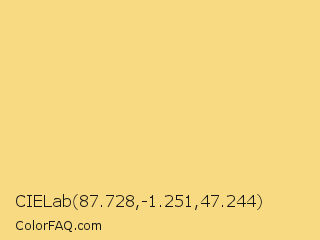 CIELab 87.728,-1.251,47.244 Color is a light orange color and the nearest color is Mellow Yellow #f8de7e. Hex code #f7da81 and RGB value is rgb(247,218,129). In RGB color space, this color is composed of 97% red, 85% green, 51% blue, In CMYK color space, this color is composed of 0% cyan, 12% magenta, 48% yellow , 3% black , In HSL color space, this color has a hue angle of 45° , 88% saturation and 74% lightness.