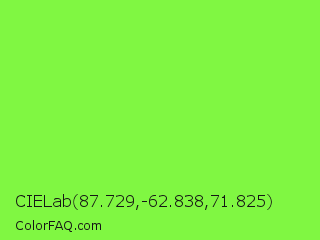 CIELab 87.729,-62.838,71.825 Color is a light green color and the nearest color is Kiwi #8ee53f. Hex code #80f742 and RGB value is rgb(128,247,66). In RGB color space, this color is composed of 50% red, 97% green, 26% blue, In CMYK color space, this color is composed of 48% cyan, 0% magenta, 73% yellow , 3% black , In HSL color space, this color has a hue angle of 99° , 92% saturation and 61% lightness.