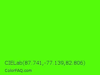 CIELab 87.741,-77.139,82.806 Color is a normal green color and the nearest color is Chlorophyll Green #4aff00. Hex code #54fc0a and RGB value is rgb(84,252,10). In RGB color space, this color is composed of 33% red, 99% green, 4% blue, In CMYK color space, this color is composed of 67% cyan, 0% magenta, 96% yellow , 1% black , In HSL color space, this color has a hue angle of 102° , 98% saturation and 51% lightness.