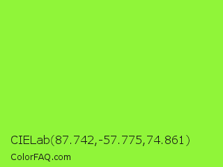 CIELab 87.742,-57.775,74.861 Color is a normal green color and the nearest color is French Lime #9efd38. Hex code #90f539 and RGB value is rgb(144,245,57). In RGB color space, this color is composed of 56% red, 96% green, 22% blue, In CMYK color space, this color is composed of 41% cyan, 0% magenta, 77% yellow , 4% black , In HSL color space, this color has a hue angle of 92° , 90% saturation and 59% lightness.