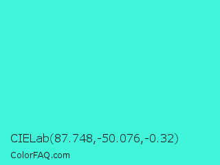 CIELab 87.748,-50.076,-0.32 Color is a light cyan color and the nearest color is Turquoise #40e0d0. Hex code #41f5db and RGB value is rgb(65,245,219). In RGB color space, this color is composed of 25% red, 96% green, 86% blue, In CMYK color space, this color is composed of 73% cyan, 0% magenta, 11% yellow , 4% black , In HSL color space, this color has a hue angle of 171° , 90% saturation and 61% lightness.