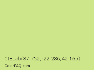 CIELab 87.752,-22.286,42.165 Color is a light lime color and the nearest color is Medium Spring Bud #c9dc87. Hex code #cee68a and RGB value is rgb(206,230,138). In RGB color space, this color is composed of 81% red, 90% green, 54% blue, In CMYK color space, this color is composed of 10% cyan, 0% magenta, 40% yellow , 10% black , In HSL color space, this color has a hue angle of 76° , 65% saturation and 72% lightness.