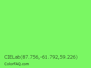 CIELab 87.756,-61.792,59.226 Color is a light green color and the nearest color is Screamin Green #66ff66. Hex code #7af763 and RGB value is rgb(122,247,99). In RGB color space, this color is composed of 48% red, 97% green, 39% blue, In CMYK color space, this color is composed of 51% cyan, 0% magenta, 60% yellow , 3% black , In HSL color space, this color has a hue angle of 111° , 90% saturation and 68% lightness.