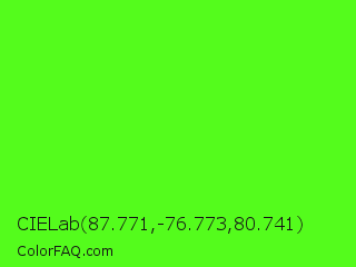 CIELab 87.771,-76.773,80.741 Color is a normal green color and the nearest color is Neon Green #39ff14. Hex code #54fc1c and RGB value is rgb(84,252,28). In RGB color space, this color is composed of 33% red, 99% green, 11% blue, In CMYK color space, this color is composed of 67% cyan, 0% magenta, 89% yellow , 1% black , In HSL color space, this color has a hue angle of 105° , 97% saturation and 55% lightness.