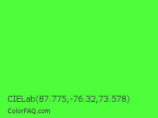 CIELab 87.775,-76.32,73.578 Color is a light green color and the nearest color is Neon Green #39ff14. Hex code #4ffc3b and RGB value is rgb(79,252,59). In RGB color space, this color is composed of 31% red, 99% green, 23% blue, In CMYK color space, this color is composed of 69% cyan, 0% magenta, 77% yellow , 1% black , In HSL color space, this color has a hue angle of 114° , 97% saturation and 61% lightness.