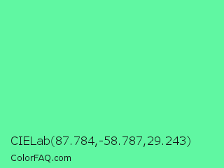 CIELab 87.784,-58.787,29.243 Color is a light green color and the nearest color is Medium Aquamarine #66ddaa. Hex code #60f7a2 and RGB value is rgb(96,247,162). In RGB color space, this color is composed of 38% red, 97% green, 64% blue, In CMYK color space, this color is composed of 61% cyan, 0% magenta, 34% yellow , 3% black , In HSL color space, this color has a hue angle of 146° , 90% saturation and 67% lightness.