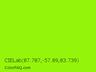 CIELab 87.787,-57.89,83.739 Color is a normal green color and the nearest color is Spring Bud #a7fc00. Hex code #94f50a and RGB value is rgb(148,245,10). In RGB color space, this color is composed of 58% red, 96% green, 4% blue, In CMYK color space, this color is composed of 40% cyan, 0% magenta, 96% yellow , 4% black , In HSL color space, this color has a hue angle of 85° , 92% saturation and 50% lightness.