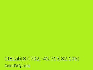 CIELab 87.792,-45.715,82.196 Color is a normal lime color and the nearest color is Inch Worm #b0e313. Hex code #b0f01c and RGB value is rgb(176,240,28). In RGB color space, this color is composed of 69% red, 94% green, 11% blue, In CMYK color space, this color is composed of 27% cyan, 0% magenta, 88% yellow , 6% black , In HSL color space, this color has a hue angle of 78° , 88% saturation and 53% lightness.