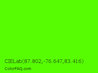 CIELab 87.802,-76.647,83.416 Color is a normal green color and the nearest color is Chlorophyll Green #4aff00. Hex code #57fc03 and RGB value is rgb(87,252,3). In RGB color space, this color is composed of 34% red, 99% green, 1% blue, In CMYK color space, this color is composed of 65% cyan, 0% magenta, 99% yellow , 1% black , In HSL color space, this color has a hue angle of 100° , 98% saturation and 50% lightness.