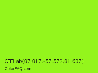 CIELab 87.817,-57.572,81.637 Color is a normal green color and the nearest color is Spring Frost #87ff2a. Hex code #94f51c and RGB value is rgb(148,245,28). In RGB color space, this color is composed of 58% red, 96% green, 11% blue, In CMYK color space, this color is composed of 40% cyan, 0% magenta, 89% yellow , 4% black , In HSL color space, this color has a hue angle of 87° , 92% saturation and 54% lightness.