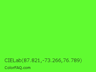 CIELab 87.821,-73.266,76.789 Color is a normal green color and the nearest color is Spring Frost #87ff2a. Hex code #60fb30 and RGB value is rgb(96,251,48). In RGB color space, this color is composed of 38% red, 98% green, 19% blue, In CMYK color space, this color is composed of 62% cyan, 0% magenta, 81% yellow , 2% black , In HSL color space, this color has a hue angle of 106° , 96% saturation and 59% lightness.
