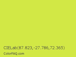 CIELab 87.823,-27.786,72.365 Color is a normal yellow color and the nearest color is Maximum Green Yellow #d9e650. Hex code #d1e845 and RGB value is rgb(209,232,69). In RGB color space, this color is composed of 82% red, 91% green, 27% blue, In CMYK color space, this color is composed of 10% cyan, 0% magenta, 70% yellow , 9% black , In HSL color space, this color has a hue angle of 68° , 78% saturation and 59% lightness.
