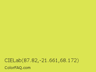 CIELab 87.82,-21.661,68.172 Color is a light yellow color and the nearest color is Maximum Green Yellow #d9e650. Hex code #dbe551 and RGB value is rgb(219,229,81). In RGB color space, this color is composed of 86% red, 90% green, 32% blue, In CMYK color space, this color is composed of 4% cyan, 0% magenta, 65% yellow , 10% black , In HSL color space, this color has a hue angle of 64° , 74% saturation and 61% lightness.