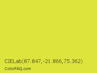 CIELab 87.847,-21.866,75.362 Color is a normal yellow color and the nearest color is Pear #d1e231. Hex code #dde53d and RGB value is rgb(221,229,61). In RGB color space, this color is composed of 87% red, 90% green, 24% blue, In CMYK color space, this color is composed of 3% cyan, 0% magenta, 73% yellow , 10% black , In HSL color space, this color has a hue angle of 63° , 76% saturation and 57% lightness.