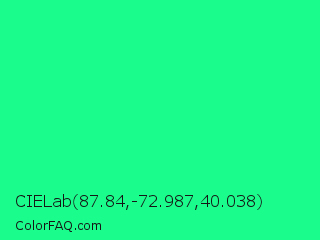 CIELab 87.84,-72.987,40.038 Color is a normal green color and the nearest color is Spring Green #00ff7f. Hex code #1afc8c and RGB value is rgb(26,252,140). In RGB color space, this color is composed of 10% red, 99% green, 55% blue, In CMYK color space, this color is composed of 90% cyan, 0% magenta, 44% yellow , 1% black , In HSL color space, this color has a hue angle of 150° , 97% saturation and 55% lightness.