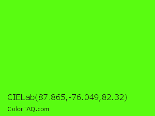 CIELab 87.865,-76.049,82.32 Color is a normal green color and the nearest color is Bright Green #66ff00. Hex code #59fc11 and RGB value is rgb(89,252,17). In RGB color space, this color is composed of 35% red, 99% green, 7% blue, In CMYK color space, this color is composed of 65% cyan, 0% magenta, 93% yellow , 1% black , In HSL color space, this color has a hue angle of 102° , 98% saturation and 53% lightness.