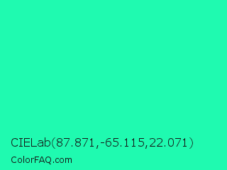 CIELab 87.871,-65.115,22.071 Color is a normal green color and the nearest color is Medium Spring Green #00fa9a. Hex code #1ffab0 and RGB value is rgb(31,250,176). In RGB color space, this color is composed of 12% red, 98% green, 69% blue, In CMYK color space, this color is composed of 88% cyan, 0% magenta, 30% yellow , 2% black , In HSL color space, this color has a hue angle of 160° , 96% saturation and 55% lightness.