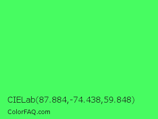 CIELab 87.884,-74.438,59.848 Color is a light green color and the nearest color is Screamin Green #66ff66. Hex code #47fc61 and RGB value is rgb(71,252,97). In RGB color space, this color is composed of 28% red, 99% green, 38% blue, In CMYK color space, this color is composed of 72% cyan, 0% magenta, 62% yellow , 1% black , In HSL color space, this color has a hue angle of 129° , 97% saturation and 63% lightness.