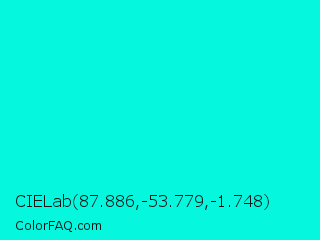 CIELab 87.886,-53.779,-1.748 Color is a normal cyan color and the nearest color is Bright Turquoise #08e8de. Hex code #05f7de and RGB value is rgb(5,247,222). In RGB color space, this color is composed of 2% red, 97% green, 87% blue, In CMYK color space, this color is composed of 98% cyan, 0% magenta, 10% yellow , 3% black , In HSL color space, this color has a hue angle of 174° , 96% saturation and 49% lightness.