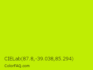 CIELab 87.8,-39.038,85.294 Color is a normal lime color and the nearest color is Las Palmas #c6e610. Hex code #bfed03 and RGB value is rgb(191,237,3). In RGB color space, this color is composed of 75% red, 93% green, 1% blue, In CMYK color space, this color is composed of 19% cyan, 0% magenta, 99% yellow , 7% black , In HSL color space, this color has a hue angle of 72° , 98% saturation and 47% lightness.