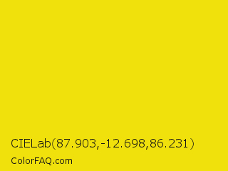CIELab 87.903,-12.698,86.231 Color is a normal yellow color and the nearest color is Titanium Yellow #eee600. Hex code #f0e00c and RGB value is rgb(240,224,12). In RGB color space, this color is composed of 94% red, 88% green, 5% blue, In CMYK color space, this color is composed of 0% cyan, 7% magenta, 95% yellow , 6% black , In HSL color space, this color has a hue angle of 56° , 90% saturation and 49% lightness.