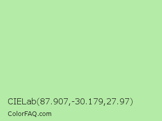CIELab 87.907,-30.179,27.97 Color is a light green color and the nearest color is Granny Smith Apple #a8e4a0. Hex code #b4eba6 and RGB value is rgb(180,235,166). In RGB color space, this color is composed of 71% red, 92% green, 65% blue, In CMYK color space, this color is composed of 23% cyan, 0% magenta, 29% yellow , 8% black , In HSL color space, this color has a hue angle of 108° , 63% saturation and 79% lightness.