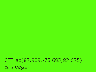 CIELab 87.909,-75.692,82.675 Color is a normal green color and the nearest color is Bright Green #66ff00. Hex code #5bfc0e and RGB value is rgb(91,252,14). In RGB color space, this color is composed of 36% red, 99% green, 5% blue, In CMYK color space, this color is composed of 64% cyan, 0% magenta, 94% yellow , 1% black , In HSL color space, this color has a hue angle of 101° , 98% saturation and 52% lightness.