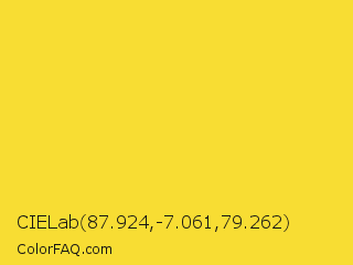 CIELab 87.924,-7.061,79.262 Color is a normal yellow color and the nearest color is Banana Yellow #ffe135. Hex code #f8dd33 and RGB value is rgb(248,221,51). In RGB color space, this color is composed of 97% red, 87% green, 20% blue, In CMYK color space, this color is composed of 0% cyan, 11% magenta, 79% yellow , 3% black , In HSL color space, this color has a hue angle of 52° , 93% saturation and 59% lightness.